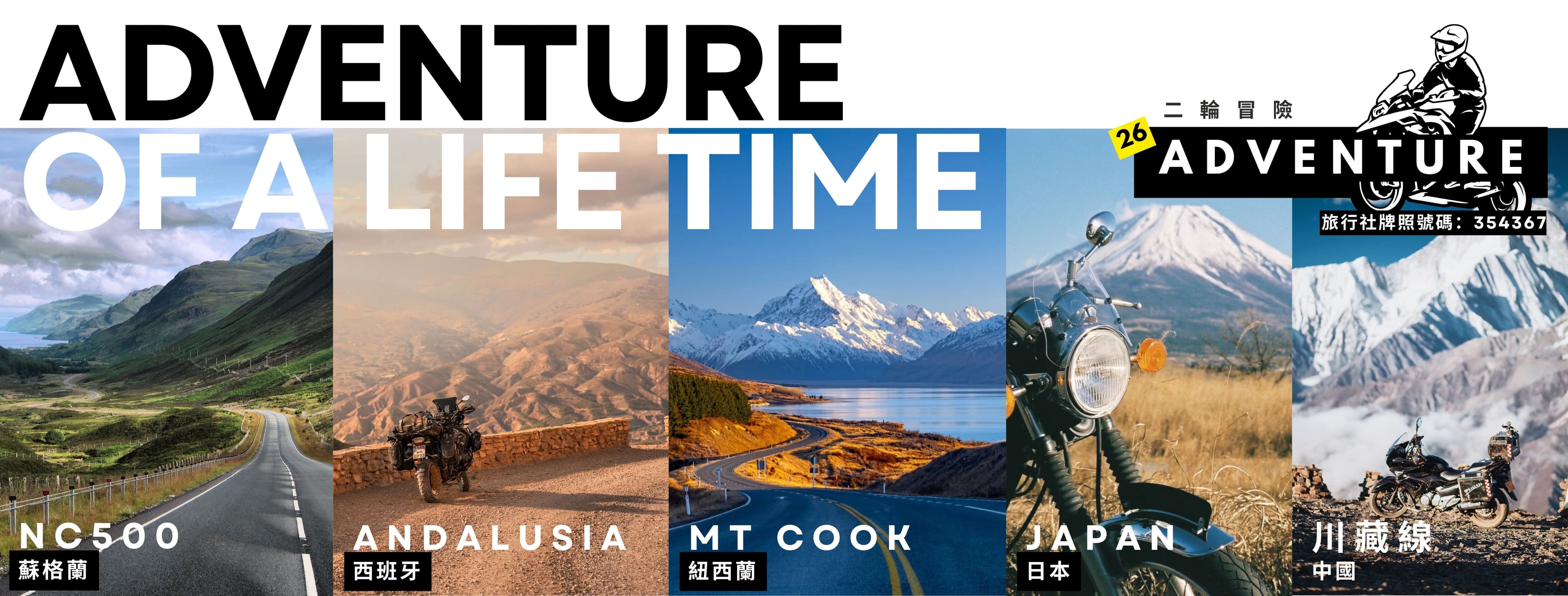 Part of Helmet King's licensed travel agency operation, 26 Adventure has run nearly 50 overseas tours — from Izu & Hakone to Scotland's NC500, Andalusia, and New Zealand's South Island.